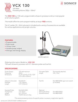 SONICS手持超聲波細(xì)胞破碎儀 VCX130:用于小批量應(yīng)用的超聲波液體處理器,130瓦特超聲處理器與定時器和脈沖器安全地處理廣泛的有機(jī)和無機(jī)材料,從150微升到150毫升。典型的應(yīng)用包括生物技術(shù)和制藥加工,包括混合、分散和樣本準(zhǔn)備使用。