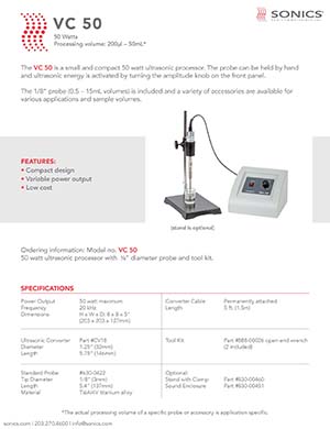 SONICS 超聲波破碎儀 VC 50:是一款小型緊湊的50瓦超聲波處理器??梢杂檬治兆√筋^,轉(zhuǎn)動前面板上的振幅旋鈕即可激活超聲波能量。包括1/8“探頭(0.5–15mL體積),并提供各種配件,用于各種應(yīng)用和樣品體積。