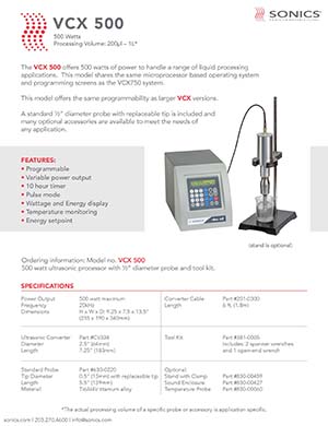 SONICS超聲波細胞破碎儀 VCX500,可安全處理各種有機和無機材料,從250微升到1升*。典型應用包括納米技術(納米顆粒材料和石墨烯分散體的生產)、細胞裂解、樣品制備、均質、ChIP分析、乳化、解聚和解聚,以及在超聲化學液體處理領域的應用。